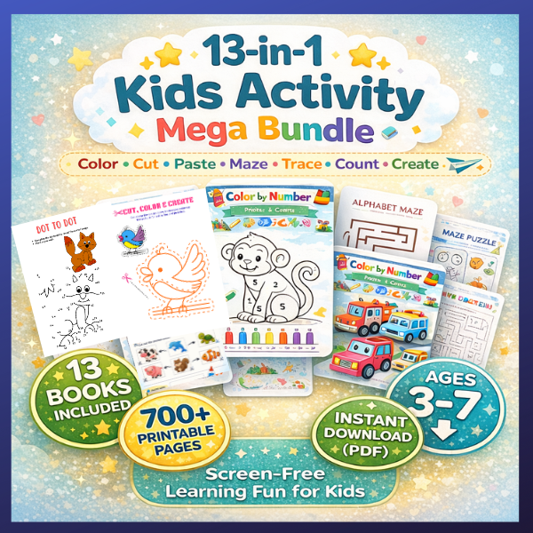 13-in-1 Kids Activity Mega Bundle (700+ Printable Pages) | Preschool Learning Worksheets, Coloring, Mazes, Tracing & Cut-Paste PDFs