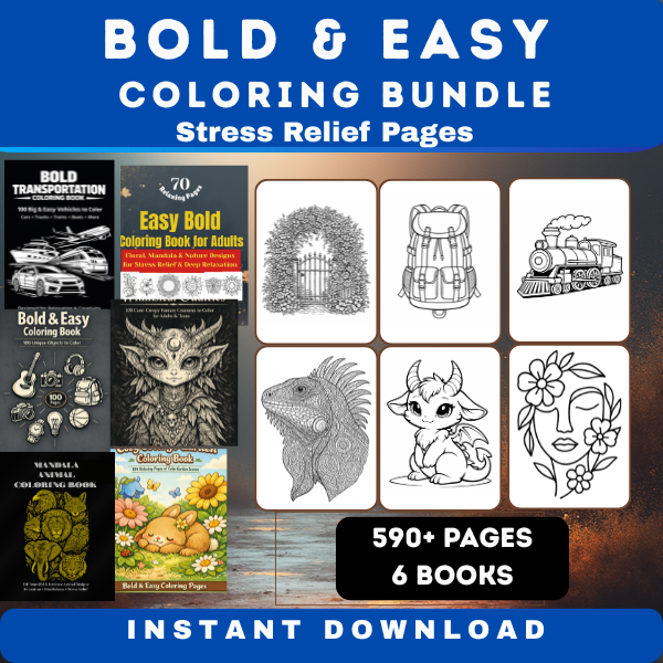 590+ Page Bold & Easy Coloring Book Bundle (6 Books, Printable PDF)