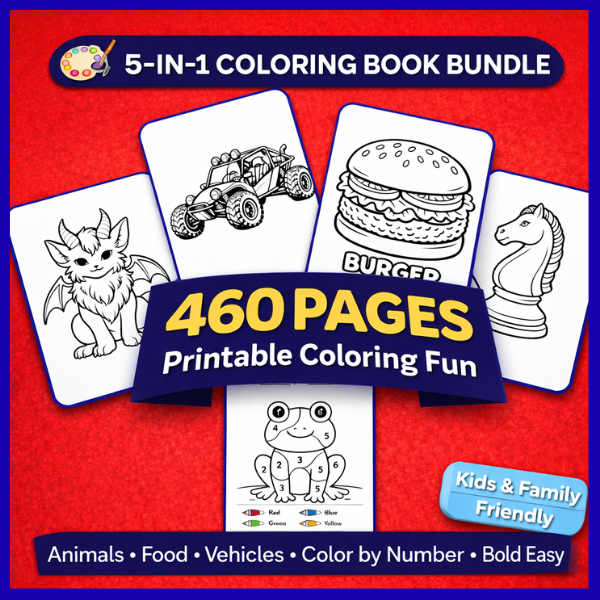5 Coloring Books Bundle (460 Pages) β Printable PDF Coloring Pages for Kids, Teens & Adults