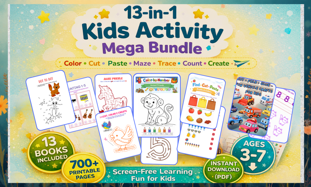 13-in-1 Kids Activity Mega Bundle (700+ Printable Pages) | Preschool Learning Worksheets, Coloring, Mazes, Tracing & Cut-Paste PDFs