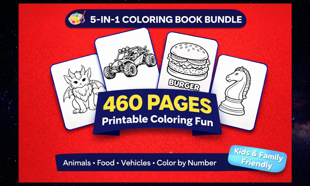 A value-packed coloring book bundle with 5 separate printable PDFs combined into one ZIP file, featuring 460 total coloring pages across multiple themes. Instant download. Print anytime.