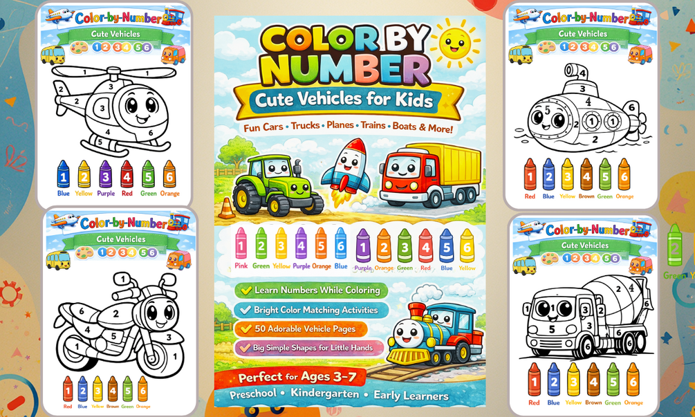Color by Number Vehicles for Kids – 50 Printable Coloring Pages, Preschool Learning Activity Ages 3–7