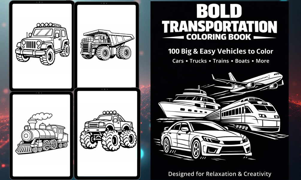 A digital transportation coloring book with 100 easy vehicle pages designed for relaxation, creativity, and stress-free coloring.